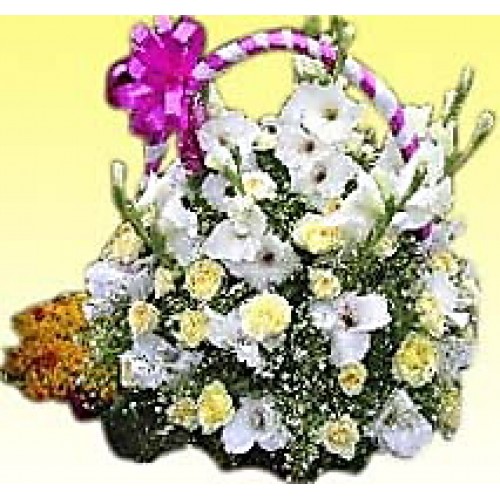 Send Gift To Bangladesh flower basket with purple orchid, fern leaf.
